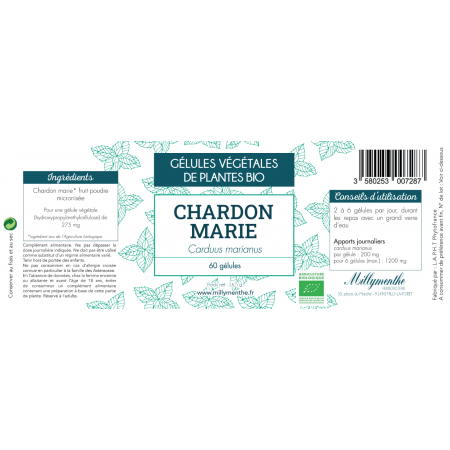 Chardon marie* (caduus marianus) fruits. Poudre micronisée 200mg par gélule. *ingrédient issu de l'agriculture biologique