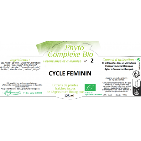 Eau, extraits de plantes: Vigne rouge*, ortie blanche*, alchémille*, armoise*, camomille matricaire*, gattilier*, marrube blanc*, mélisse*, origan*, alcool 16% vol. *Ingrédient issu de l'agriculture biologique.